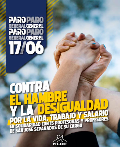 La Mesa Representativa del PIT-CNT definió las características y particularidades del paro general del próximo jueves 17 de junio, contra el hambre y la desigualdad, por trabajo y salario, en defensa de la vida y en solidaridad con los 15 profesores de San José separados del cargo.