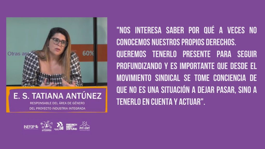En tanto, Tatiana Antúnez, referente del Proyecto Industria Integrada del Instituto Cuesta Duarte, dijo al Portal del PIT-CNT que la encuesta evidenció que «hay constantes, por ejemplo que la violencia física se produce fundamentalmente en el seno del hogar y las restantes violencias mayoritariamente se dan en los ámbitos de trabajo» y que 2/3 de las encuestadas manifestaron haber vivido alguna situación de violencia, mientras que 1/3 asegura vivirla de manera semanal. Según Antúnez, la encuesta también confirmó las asimetrías de poder y cómo se visibilizan de acuerdo a los estereotipos marcados en la sociedad. Otro de los aspectos que Antúnez mencionó fue la necesidad de herramientas para acompañar los procesos de las personas que sufrieron o sufren situaciones de violencia.