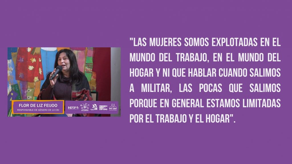 Flor de Liz dijo que las mujeres están afrontando una dura batalla contra la explotación que persiste “en el mundo del trabajo y en el mundo del hogar” y “ni que hablar cuando las mujeres salimos a militar, que no somos muchas porque estamos limitadas al mundo del trabajo y del hogar”. La responsable de género de la CSI recordó cuando en plena ronda de negociación colectiva un representante le dijo “para qué quieren ustedes aumento si son el complemento del salario de sus maridos”. Flore de Liz reveló que “gracias a eso pusimos el tema de la inequidad arriba de la mesa como para concientizar lo que nos estaba pasando, porque incluso nosotras mismas a veces normalizamos la situación de nuestra vida”.