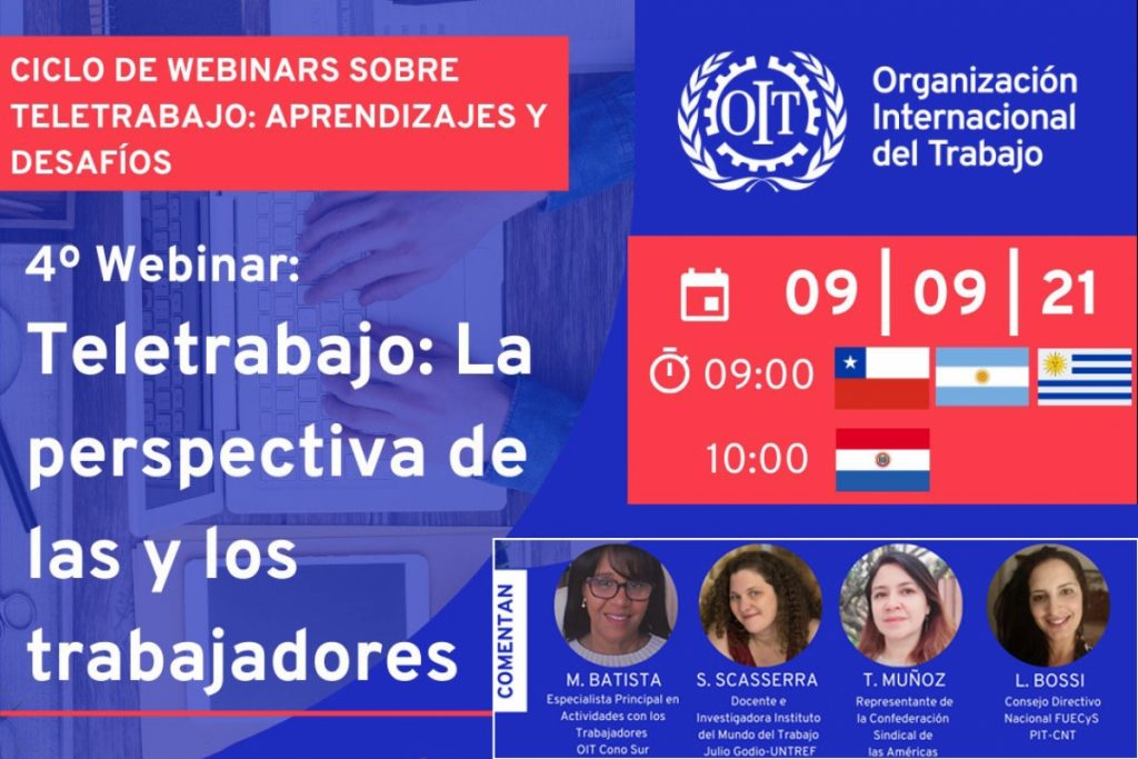 El próximo 9 de setiembre, se realizará el webinario, «Teletrabajo: la perspectiva de los Trabajadores». La actividad es organizada por la oficina de OIT Cono Sur en el marco de un ciclo de webinars sobre teletrabajo, aprendizaje y desafíos.
