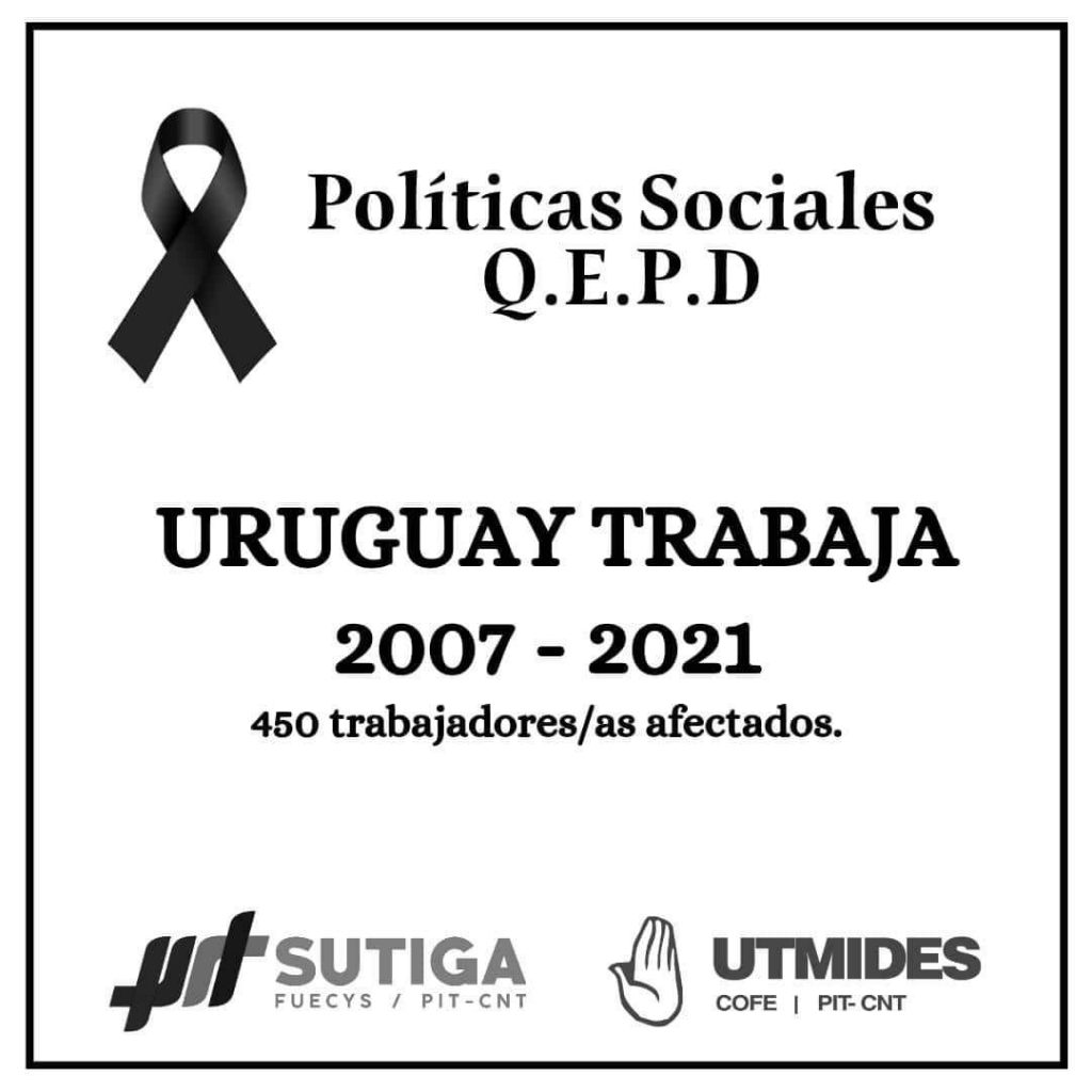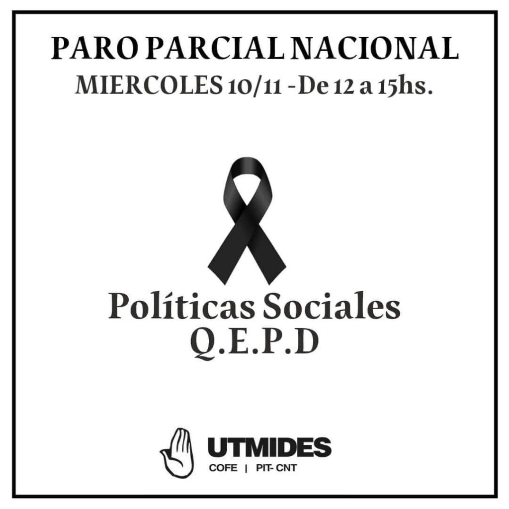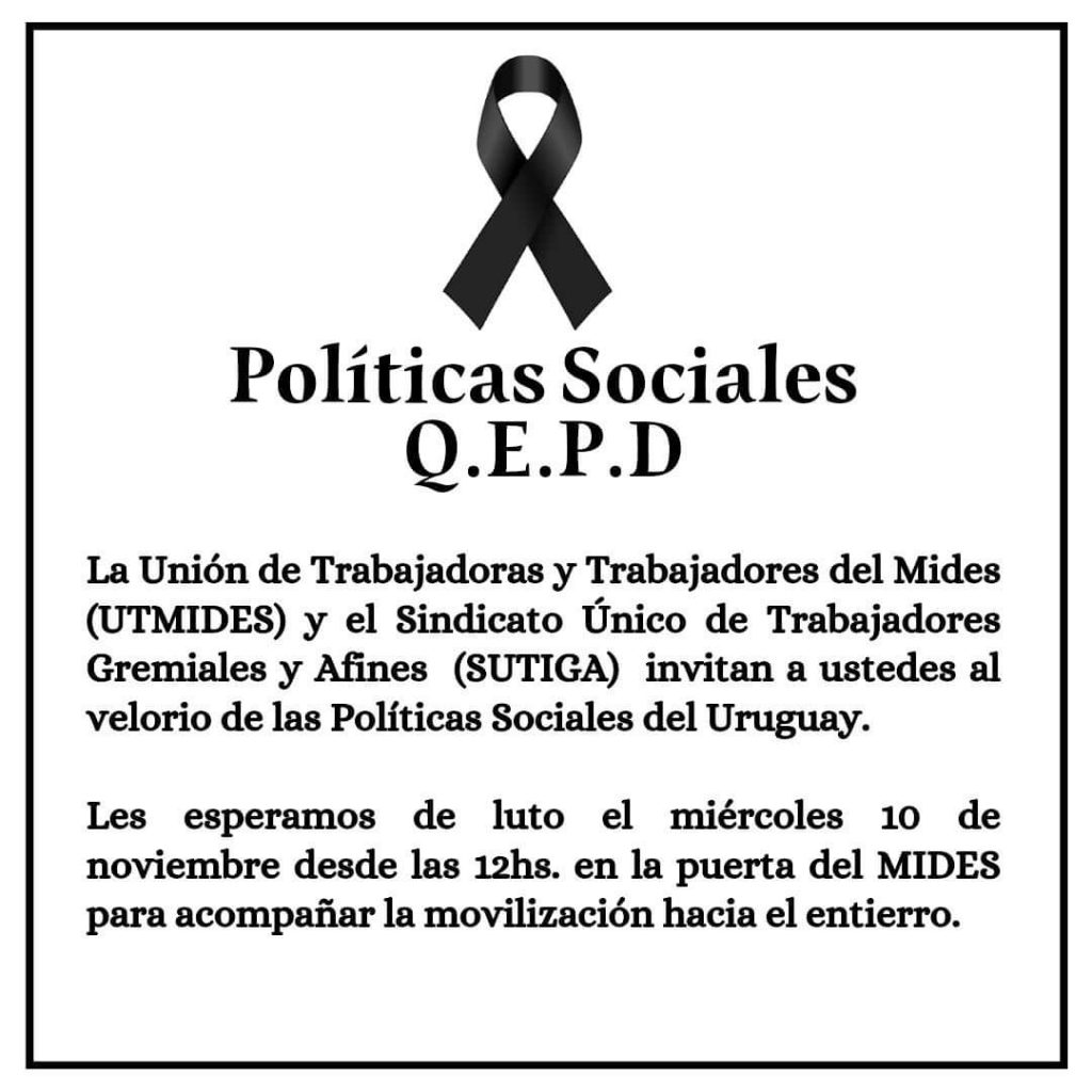 El próximo miércoles 10, la Unión de Trabajadores del Ministerio de Desarrollo Social (UTMIDES) y el Sindicato Único de Trabajadores Gremiales y Afines (SUTIGA) realizarán un paro general parcial con movilización, con motivo del velorio de las políticas públicas en materia de desarrollo social del Uruguay.