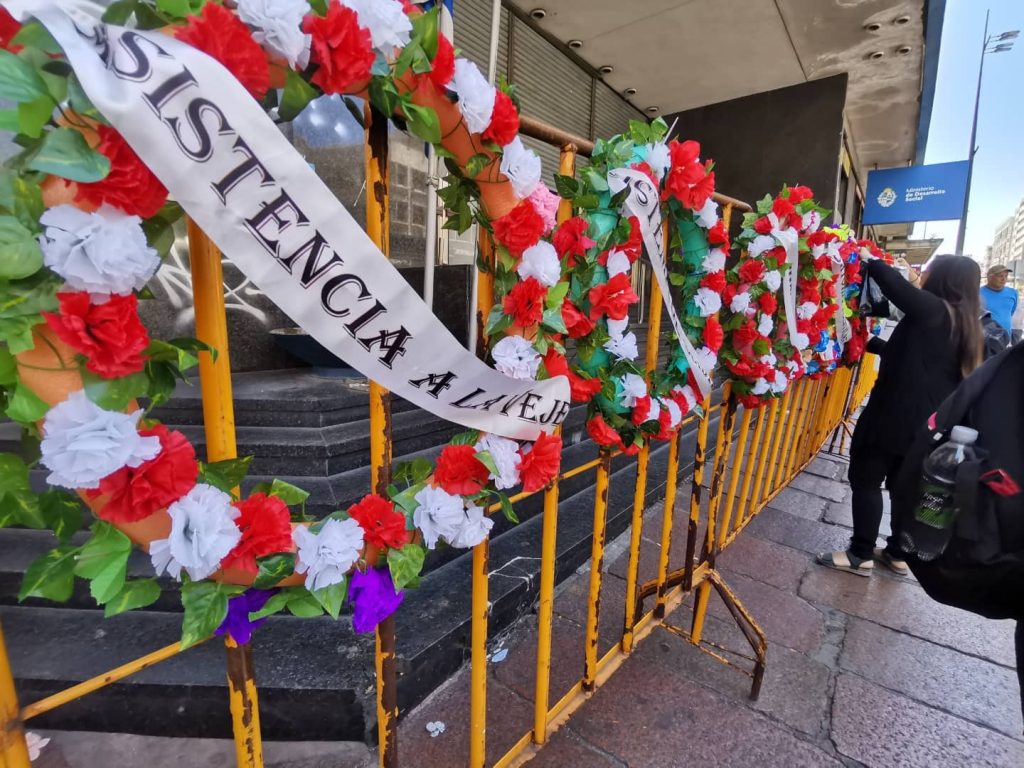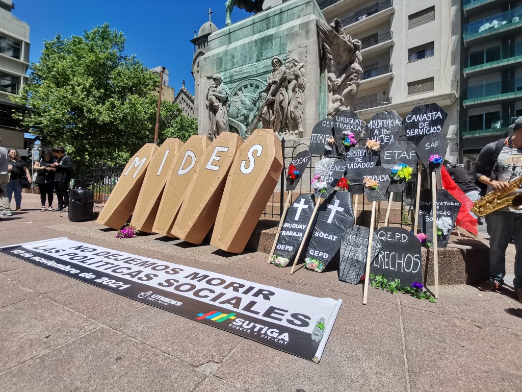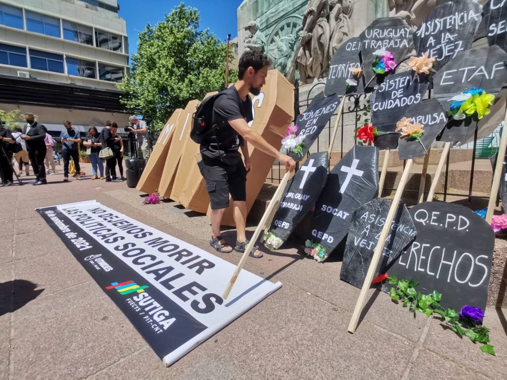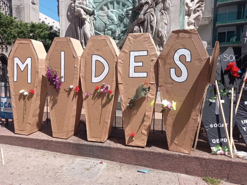 Con vestimenta de luto, carteles, consignas y ataúdes, las y los trabajadores del MIDES se manifestaron este mediodía y expresaron su fuerte rechazo a la decisión política del gobierno de vaciar de contenido y «matar» las políticas sociales.