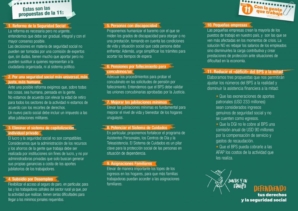 La Lista 11 que lleva el lema «Con la gente que trabaja», está conformada por hombres y mujeres de Montevideo y del interior del país, trabajadores y trabajadoras provenientes de distintos sectores de actividad como la industria, el comercio o los servicios, por ejemplo, del ámbito público y privado.´