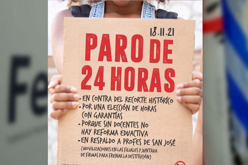 La medida se resolvió «contra el recorte histórico” y porque “sin docentes no hay reforma educativa”. Asimismo, el paro se realizará por una elección de horas con garantías, porque “sin docentes no hay reforma educativa” y en respaldo a los docentes de San José.