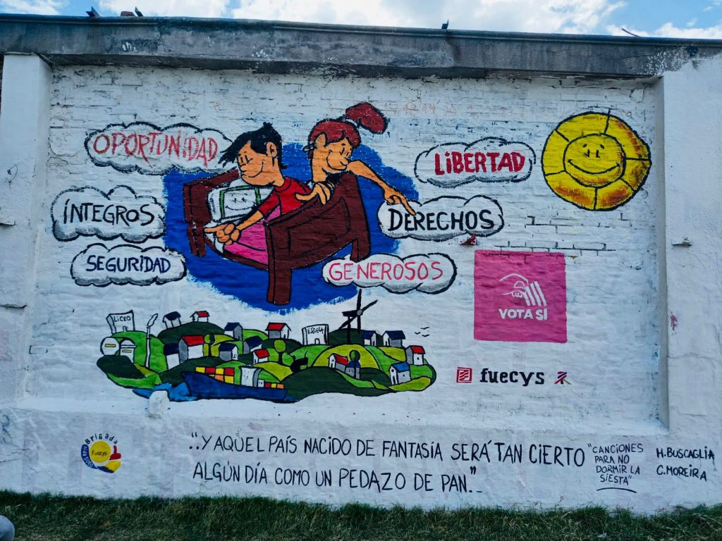 Según contó al Portal del PIT-CNT, María Noel Machado, la iniciativa de las y los jóvenes se canalizó a través de la Brigada Aída Soto de FUECYS. “Los muros son espacios de intervención artística pero también son ámbitos donde queremos expresar nuestras ideas sobre lo que estamos viviendo como sociedad”.
