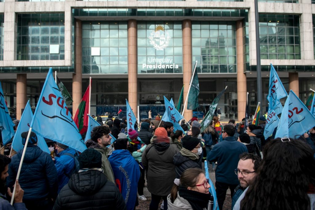 En la presente jornada, se desarrolló la movilización de la Mesa Sindical Coordinadora de Entes (MSCE) frente a la Torre Ejecutiva y desde allí se efectuaron diversos planteos de rechazo a la rebaja salarial, así como también, se exigió al presidente de la República que cumpla con lo prometido en materia de recuperación salarial.