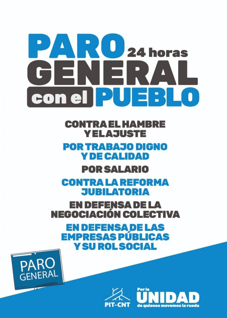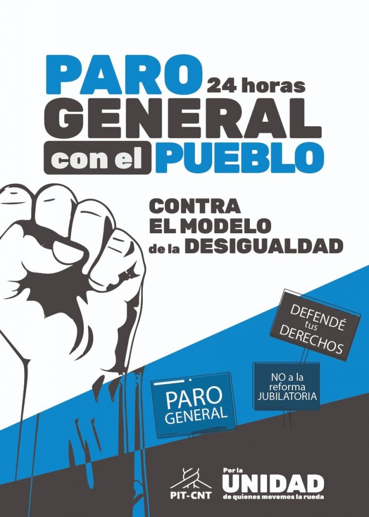 La Mesa Representativa del PIT-CNT resolvió este jueves, convocar a un paro general de 24 horas el próximo día 15 de setiembre. La convocatoria es contra el modelo de desigualdad, contra al hambre y el ajuste, por trabajo digno y de calidad, por salario, contra la reforma jubilatoria, en defensa de la negociación colectiva y de las empresas públicas.