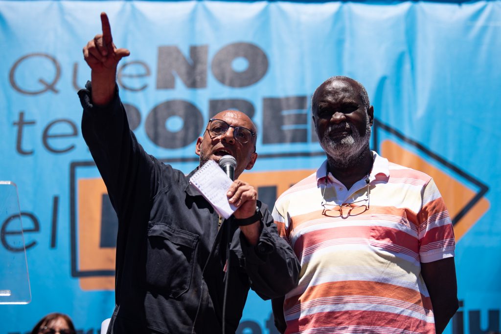 Flanqueado en el estrado por dirigentes integrantes del Secretariado Ejecutivo, rodeado por miles de banderas y carteles de distintos sindicatos, el presidente del PIT-CNT le habló a la multitud buscando cercanía y por momentos parecía querer bajar a charlar con las y los militantes caminando entre ellos. Con una libretita de apuntes a modo de «ayuda memoria» en una de sus manos, llamó la atención que no se detuvo ni una sola vez a observarla -ni siquiera de ‘reojo’- en toda su intervención.