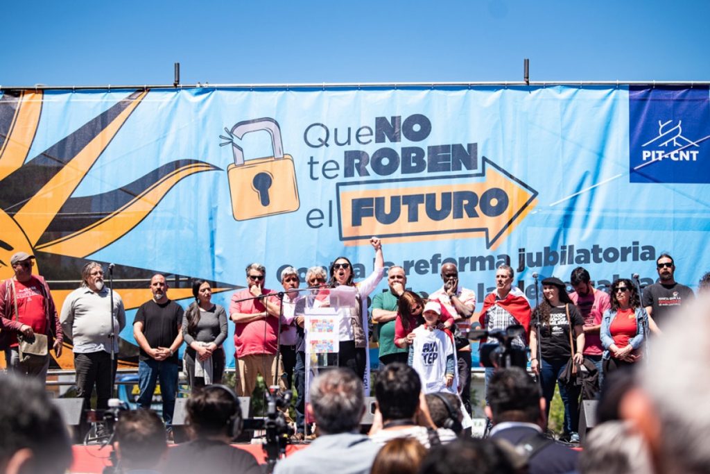 El acto central del PIT-CNT tuvo como oradora inicial a la presidenta de la Asociación de Trabajadores de la Seguridad Social (ATSS), Karina Sosa, quien se refirió al proyecto de reforma jubilatoria en duros términos, y remarcó que se trata de una reforma «salvaje» que el gobierno pretende imponer. «No hay posibilidad de acordar nada sobre la base de este proyecto, destinado a mejorar la renta del capital privado y a preservar privilegios de unos pocos en detrimento de tantos y tantas uruguayas y uruguayos», agregó.