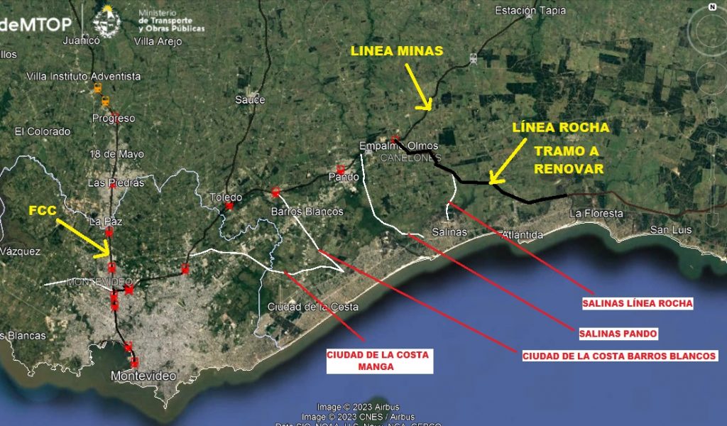 Adicionalmente proponemos el tendido de un trazado desde Salinas hacia la línea Rocha de 5km de extensión, permitiendo la conexión rápida hacia Montevideo, sin tener que retroceder hacia Estación Atlántida o Parque del Plata.