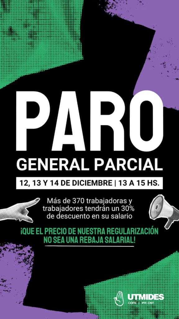 Durante el martes 12, miércoles 13 y jueves 14 de diciembre, Utmides para desde las 13 hasta las 15 hs. en todo el país porque más de 370 trabajadoras/es tendrán un 30% de descuento en su salario. Paramos y nos movilizamos en rechazo a esta rebaja salarial.