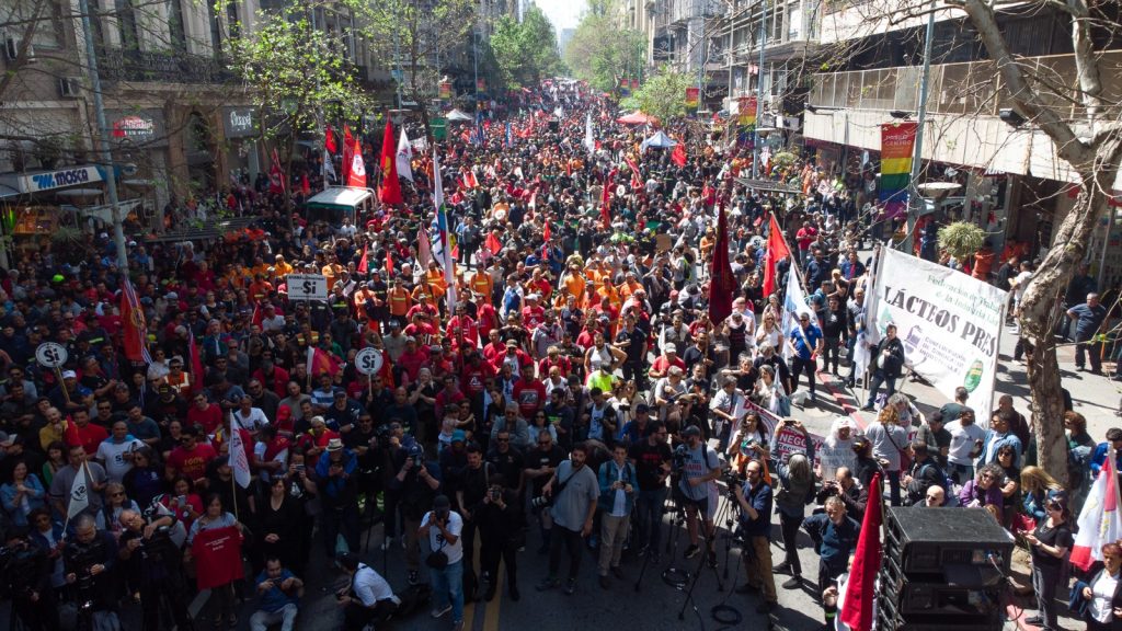 Con la convocatoria del PIT-CNT, en respaldo a los sindicatos de la educación y otros gremios que se encuentran en conflicto, miles de trabajadoras y trabajadores marcharon por el centro de Montevideo en protesta contra la reforma educativa y en defensa del empleo, denunciando recortes en educación, salud y jubilaciones y a favor de la papeleta blanca del Sí por la seguridad social.