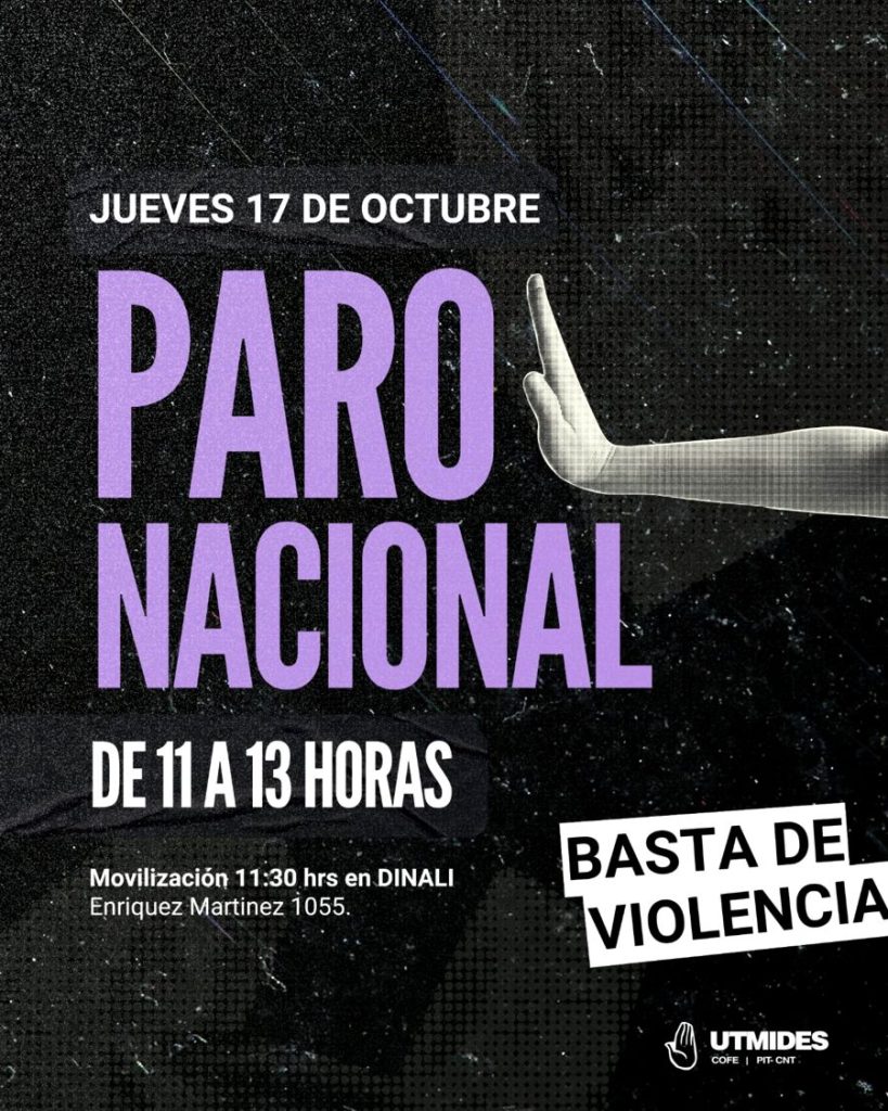 Por tal motivo, UTMIDES resuelve la realización de un Paro Nacional Parcial el próximo jueves 17 de octubre de 11:00 a 13:00 hs., con concentración a las 11:30 frente a DINALI (Gral. Enrique Martínez 1055).