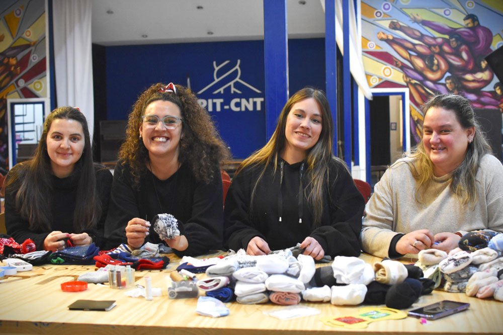 Leticia, Anita, Fernanda y Viviana son militantes de la Coordinadora de Sindicatos de Tiendas y se encontraron en la central sindical para reparar más de 400 pares de medias donadas por dos empresas del mercado, que ofrecieron dar su aporte a la campaña del abrigo con cientos de pares de muestras de sus colecciones. La particularidad de esas muestras es que desde su lugar de origen, China, vienen con un orificio de fábrica para que esas muestras no se puedan comercializar.